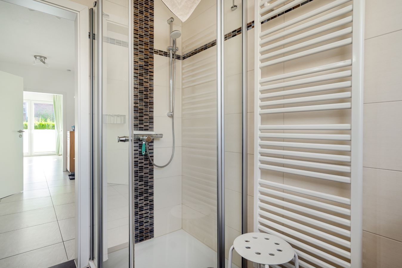 Ein Komfortbad mit bodentiefer Dusche und Handtuchheizkörper.
