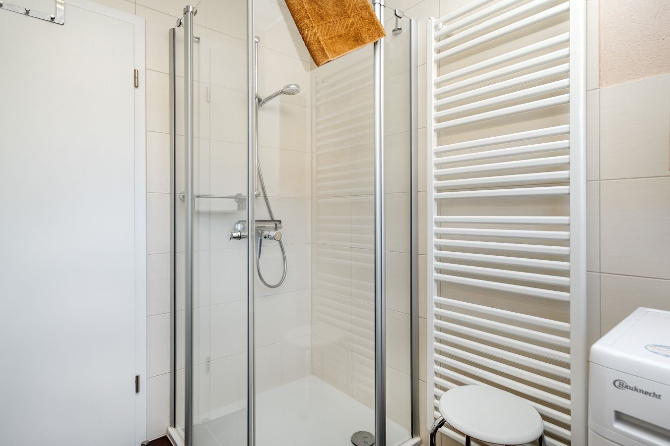 Ein Komfortbad mit bodentiefer Dusche und Handtuchheizkörper.