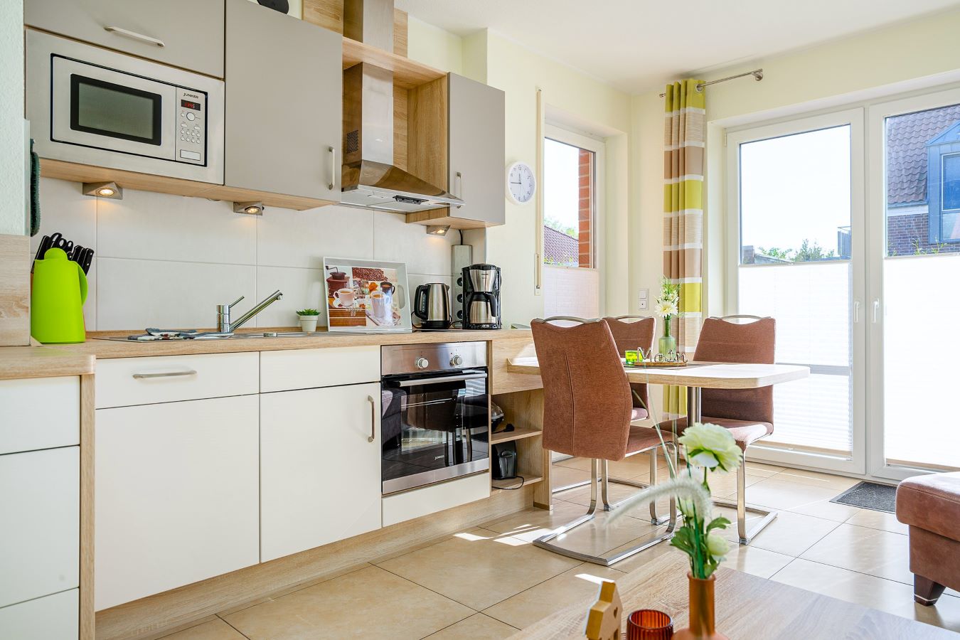 Sie finden einen Essbereich für 3 Personen und eine voll ausgestattete Küchenzeile vor.