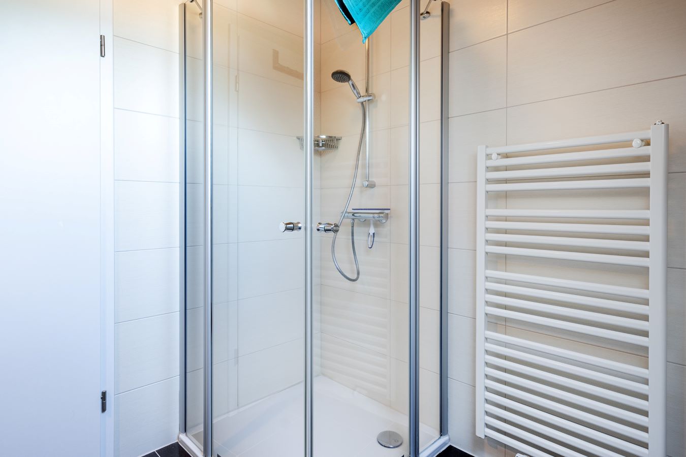 Ein Komfortbad mit bodentiefer Dusche und Handtuchheizkörper.