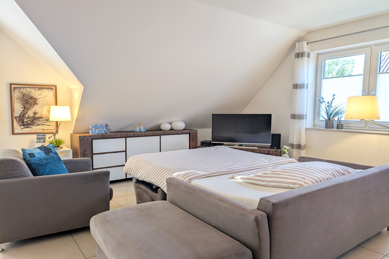 Die Ferienwohnung verfügt über 1 Schlafzimmer und Schlafsofa. Ein Kinder Reisebett kann kostenlos gestellt werden.